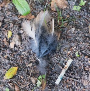 Těsně nad ránem, když vyběhnu na malou, všimnu si několika ptačích pírek.