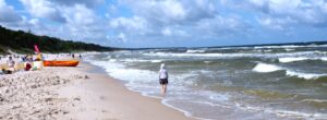 Nejprve se vypravíme parkem na pláž Wydmova. A na ní jsou davy lidí. I když sluníčko pálí, většina z nich má na sobě mikinu, bundu a kolem sebe takové plátěné ohrádky, které jsou v Polsku nesmírně moderní a k vodě si je nosí téměř každý podobně jako třeba my si k ní oblékáme plavky. Chrání je totiž před studeným větrem, který vane od moře a ten zrovna dneska vane docela dost.