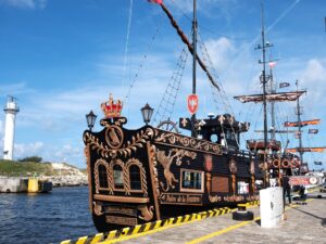 Prošli jsme se po nábřeží, omrkli zdejší výletní a historicky výletní lodě, které vás provezou po okolí. Mají tu i několik mol se vstupem 3 – 7 zt. My jsme ale zamířili k majáku. K naší smůle se zrovna opravuje, takže byl celý zakrytý a zvenčí nebylo vidět nic. Nahoru si ale vystoupat můžete. VVVstup je 15 zt na jednoho a karty tady, snad jako na jediném místě, kde jsme byli, neberou. Takže pro nás problém, protože v Polsku jsme bezhotovostní a v kapse nám necinká ani jeden zlotý.