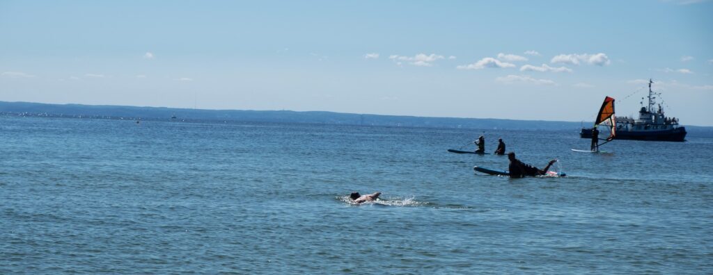 Naším dnešním cílem je Helská kosa, což je úzký poloostrov vzniklý z několika malých ostrůvků. Na délku má cca 30 km a šířka je místy tak tak na to, aby se sem vešla vedle sebe silnice, cyklostezka, vlak a proužek lesa. Potom mraky turistů a mraky parkovišť. Na každém dvorku či zahradě stojí naháněči a všichni chtějí, abyste si u nich zaparkoval.