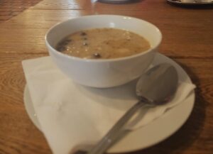A tak už víme, že bydlíme jinde, ale máme hlad, a tak jim tam aspoň uděláme malou tržbičku. Dáme si polévku – kyselicu za 79,-. A ta je naprosto dokonalá. Chuťově vvvážená i pěkná porce. Olizujeme se až za ušima a musím přiznat, že tahle polévka byla rozhodně lepší, než kachna, kterou jsem si později dala k večeři. Takže kuchyň na zámku jednoznačně doporučujeme. Aspoň do té doby, než změní kuchařku.