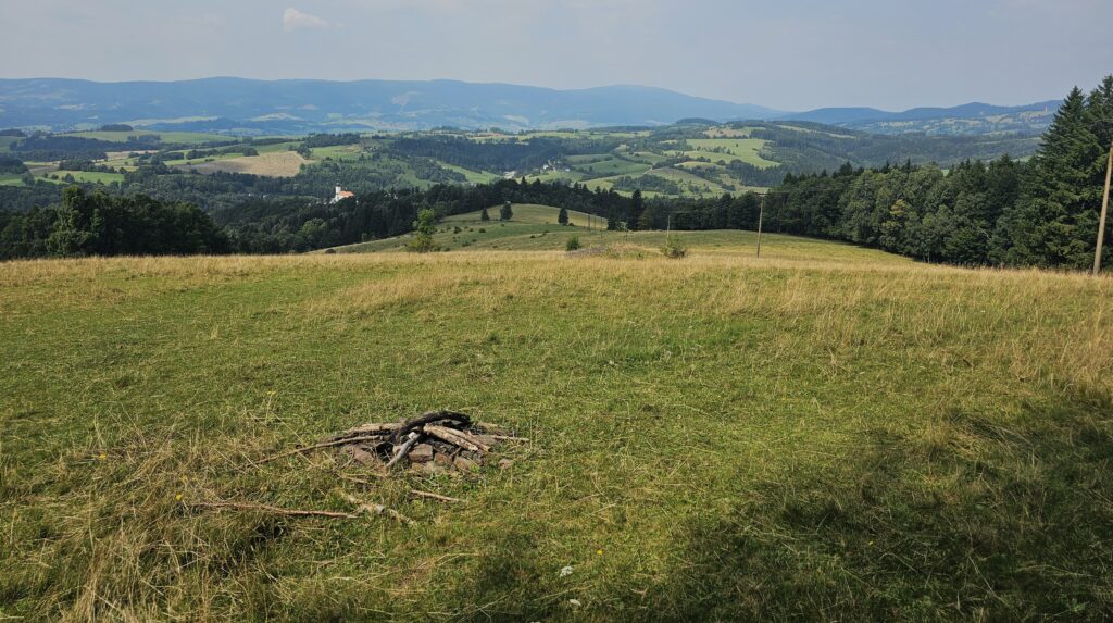 Víc než lidí je tu ovšem pasoucích se nebo polehávajících krav. Rozsáhlé louky k pastvě přímo vybízejí, a tak si musíme dávat neustále pozor na elektrický ohradník, který zasahuje zhusta na turistickou stezku, přičemž z druhé strany do ní zasahuje houští. A tak občas přeskočíme či podlezeme (to podle naší rozdílné výšky) jak mladá telátka, dávaje si pozor, abychom nedostaly ránu.  A kocháme se výhledy, kterým tady nic nepřekáží. Je vidět do daleka, v jednom bodě dokonce i Králický sněžník, na což nás upozorní kovová mapa.