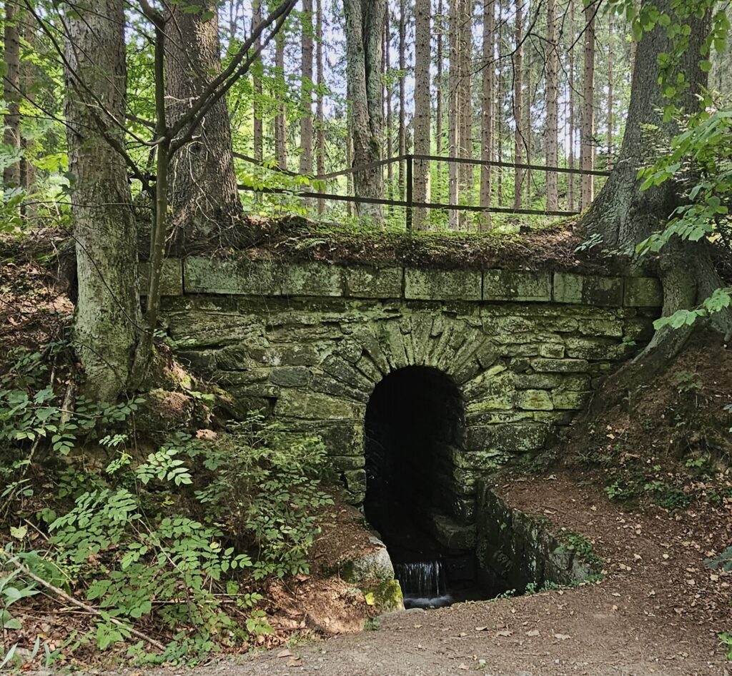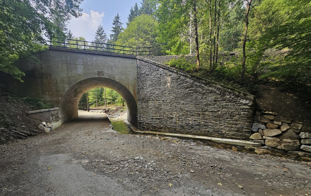 Takže 10, shodneme se a vyrazíme po zelené k Viaduktu. A ten patří k těm nejhezčím místům na trase. Vede tu most přes Brannou, je tu moc hezká studánka a taky božský klid.